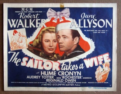 | 61. DS37 Sailor Takes Wife HIRSCHFELD Title Lobby Card.Here's a terrific TITLE lobby card from the original release of THE SAILOR TAKES A WIFE featuring a great image of ROBERT WALKERand JUNE ALLYSON. The artwork and the caricatures on the card are by HIRSHFELD which makes it highly collectible.Lobby card is in GOOD-condition. No pinholes,a tape stain on the upper border,a very large circular tear in the center of the card repaired with brown paper masking tape on back. It will look okay in a book or a frame. by n/a | |