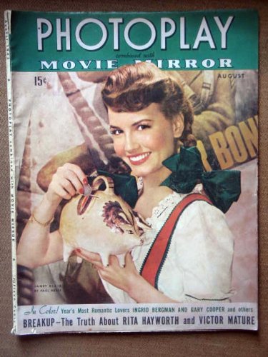 | 11. PHOTOPLAY August 43 featuring Janet Blair on the cover. Articles & photos on Ingrid Bergman, Cary Grant, Gary Cooper, Rita Hayworth, Victor Mature, Betty GRable & Harry James, Alice Faye, Ann Sothern, Larraine Day, Joan Fontaine & Orson Welles in Jane Eyre, Spencer Tracy, Deanna Durbin, Bette Davis. Full page ad for Humphrey Bogart in Action In The North Atlantic and Gene Tierney in Heaven Can Wait. by Fred Sammus | |