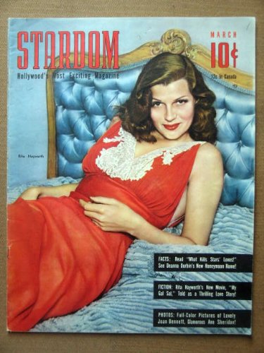| 19. STARDOM March 1942 (oversized) issue featuring fabulous image Rita Hayworth on the cover. Articles & photos on Bette Davis, James Stewart & Carole Landis, Betty Grable, June Havoc, Barbara Stanwyck, Ginger Rogers, Ann Sheridan, Deanna Durbin, Carole Lombard, Claudette Colbert, Cary Grant . Full page ad for Ginger Rogers in Roxy Hart. by Fred Sammus | |