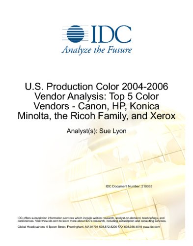 Editorial Review Product Description This IDC study examines five vendors in the U.S. hardcopy market that have consistently targeted growth in share of color hardcopy pages for the past few years: Canon, HP, Konica Minolta, the Ricoh family, and Xerox. These vendors have been challenged by Dell, Sharp, and Lexmark in the enterprise environment. This study reviews the trends of the top 5 vendors in the production environments of production color 45ppm+ MFPs, high-end color systems (HECS), and highlight color, and it provides a current profile providing the foundation for future growth. "Production color vendors will be continually challenged to create the next fresh case for a color production job to migrate from offset to digital." - Sue Lyon, research director, IDC Hardcopy Peripherals and Document Solutions | |