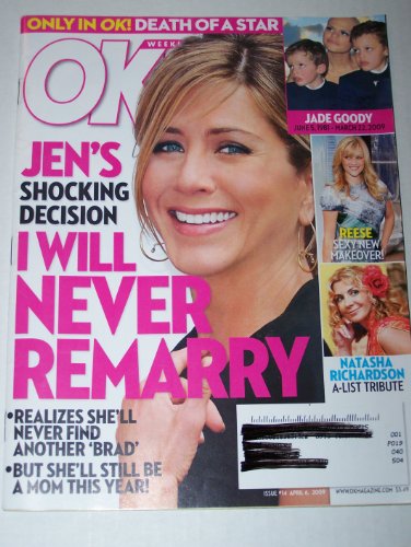 | 7. OK Weekly Magazine Jennifer Aniston Jen's Shocking Decision I Will Never Marry, Issue #14 April 6, 2009, Jade Goody, Reese Witherspoon, Natasha Richardson, Liam Neeson, Britney Spears, Paris Hilton, Mariah Carey by OK Magazine | |