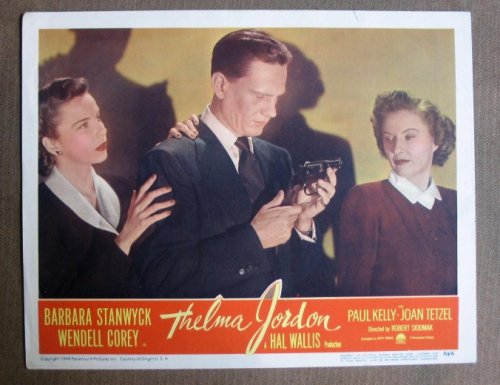 | 80. CZ39 THELMA JORDAN Barbara Stanwyck CLOSEUP '50 LC.Here’s a terrific PORTRAIT lobby card from the original release of THELMA JORDON featuring a great image of BARBARA STANWYCK and WENDELL COREY.Lobby card is in EXCELLENT- condition. No pinholes, no stains, no tears, a tiny chip on the lower left hand corner has been replaced. A lobby card is an 11 x 14 inch placard advertising a movie. They were displayed in the theatre lobby to entice moviegoers to go to the box office and buy a ticket. by notapp | |