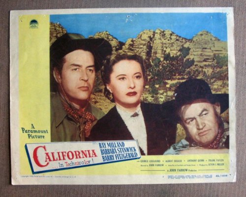 | 75. DJ08 California BARBARA STANWYCK 46 Portrait Lobby Card.Here’s a terrific PORTRAIT lobby card from the original release of CALIFORNIA featuring a great image of BARBARA STANWYCK, RAY MILLAND and ALBERT DEKKER.Lobby card is in VERY GOOD-condition. Some pinholes, no stains, no tears. A lobby card is an 11 x 14 inch placard advertising a movie. They were displayed in the theatre lobby to entice moviegoers to go to the box office and buy a ticket. by n/a | |