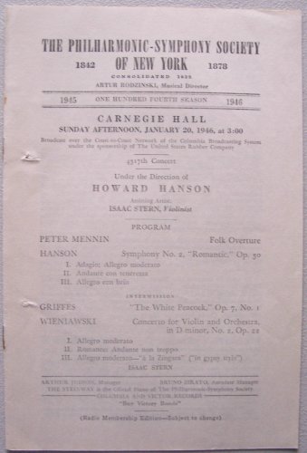 | 59. The Philharmonic-Symphony Society of New York 1946, 4317th Concert Program, One Hundred Fourth Season, Under the Direction of Howard Hanson, Assisting Artist: Isaac Stern, Violinist (Carnegie Hall, Sunday Afternoon, January 20, 1946, at 3:00, Broadcast over the coast-to-coast Network of the Columbia Broadcasting System under the sponsorship of The United States Rubber Company) by Manager Arthur Judson, Associate Manager Bruno Zirato | |